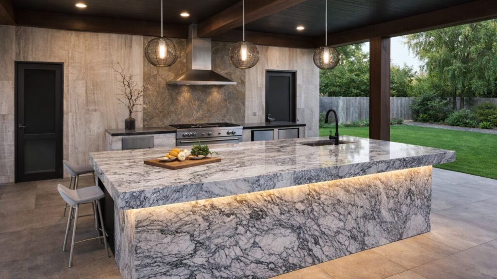 Quartzite handles high temperatures better than many engineered materials and offers excellent scratch resistance. It does require periodic sealing, but many homeowners and designers accept that tradeoff for its natural movement and upscale appearance. For shaded or partially covered outdoor kitchens, quartzite is often a top-tier option.